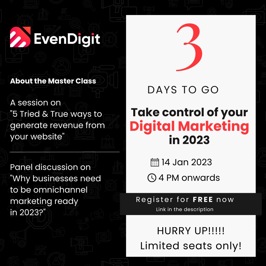 Join the Master Class - “Take Control of your Digital Marketing in 2023” powered by EvenDigit 📅 Saturday, 14th January 2022 ⏰ 4:00 PM – 6:30 PM 📍 Please register for venue details DM or register on https://t.co/wPDDAAQ4hr to get the FREE INVITATION toda