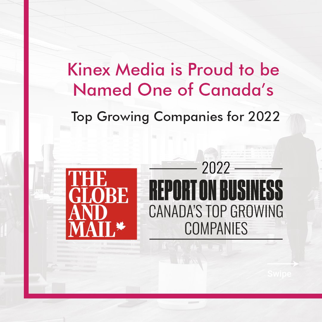 We have some exciting news and invite you to celebrate with us! We’re pleased to announce that Kinex Media has been named to the prestigious Globe and Mail 2022 Canada’s Top Growing Companies report. #TopGrowing22 #theglobeandmail #Canadastopgrowingcompany22 #KinexMedia